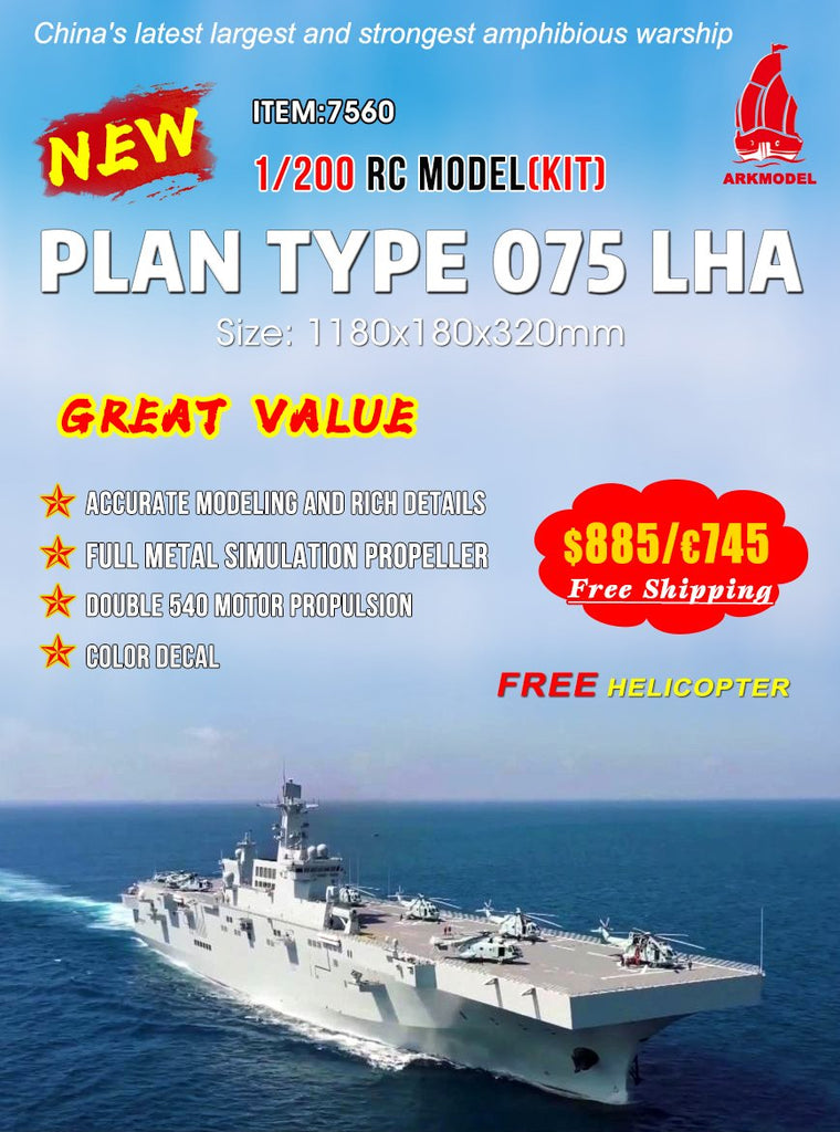 Arkmodel 1/200 Plan Type 075 LHA Amphibious Assault Ship RC Warship Model KIT No.7560