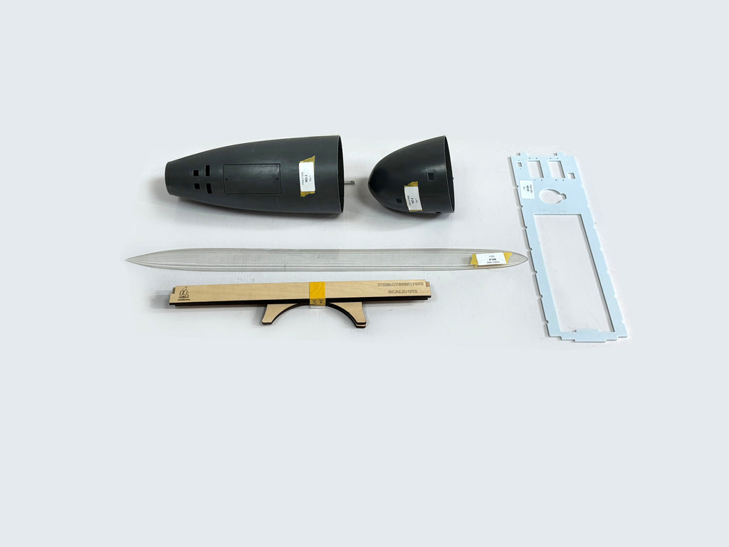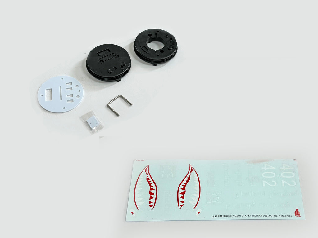 This kit(hull) comes with almost everything that needs to build an RC running model.Kit includes a hull, decks, Injection parts, CNC-sheets, decals, instructions, machinery and electronic equipments such as motor, pump, solenoid,stuff boxes, propellers.