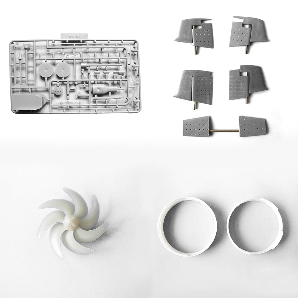 Kit includes a hull, decks, Injection parts, CNC-sheets, decals, brass photo etch, instructions and other parts for WTC installation.